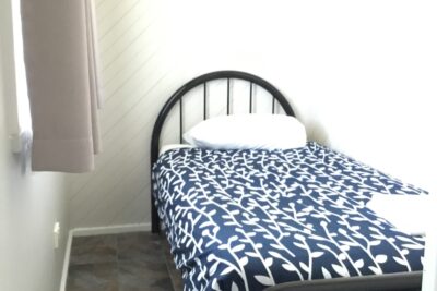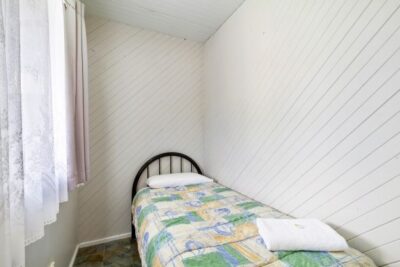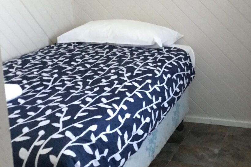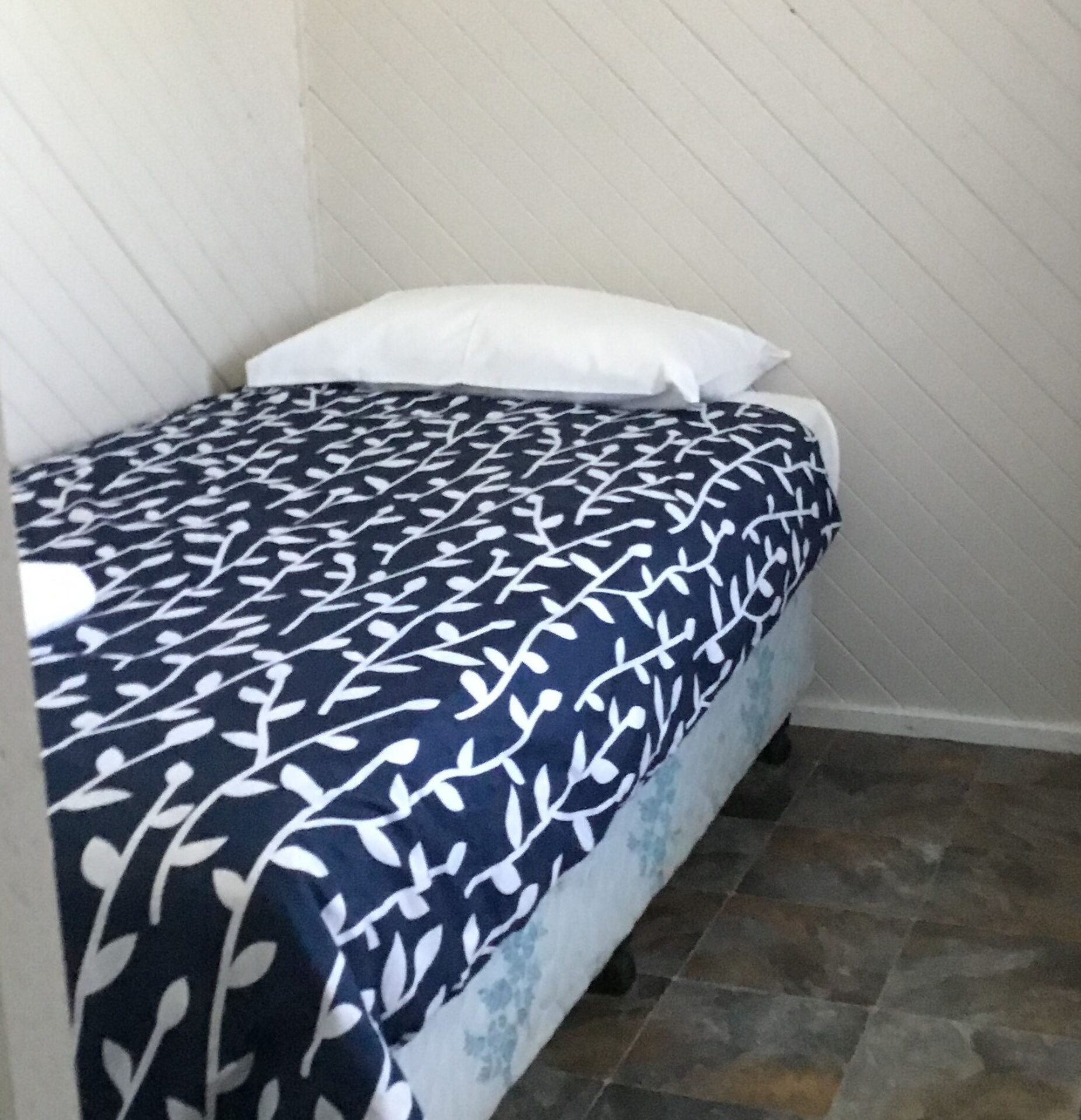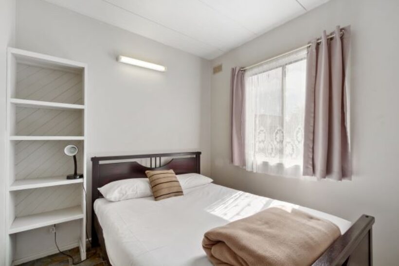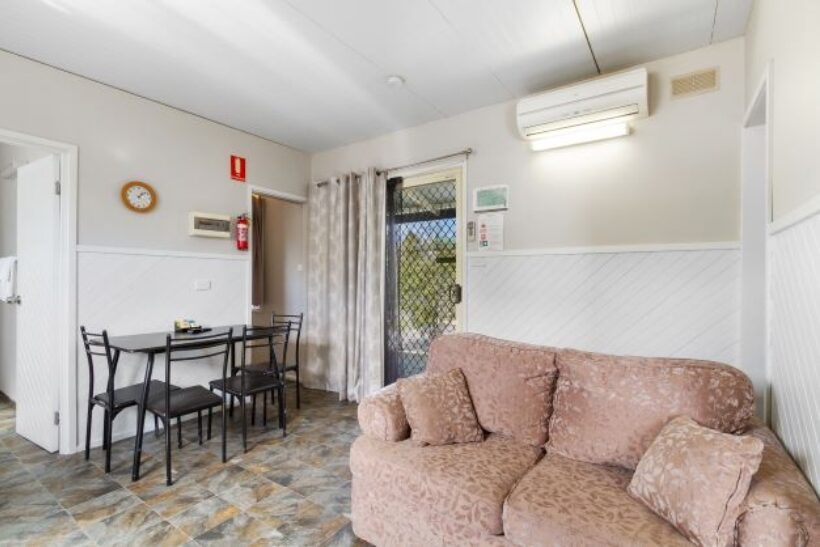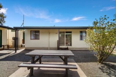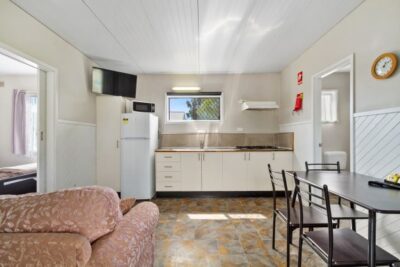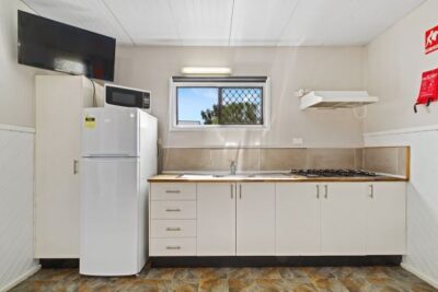 Great for families, this three-bedroom cabin sleeps up to 4 guests with a queen bed and two singles across separate rooms. The kitchenette is equipped with a gas stovetop, microwave, toaster, and full-size fridge, offering everything needed for casual dining. Air conditioning, heating, and a TV provide all-seasons comfort and entertainment. Pet-friendly and functional, it’s a comfortable choice for longer stays or travellers needing extra space.